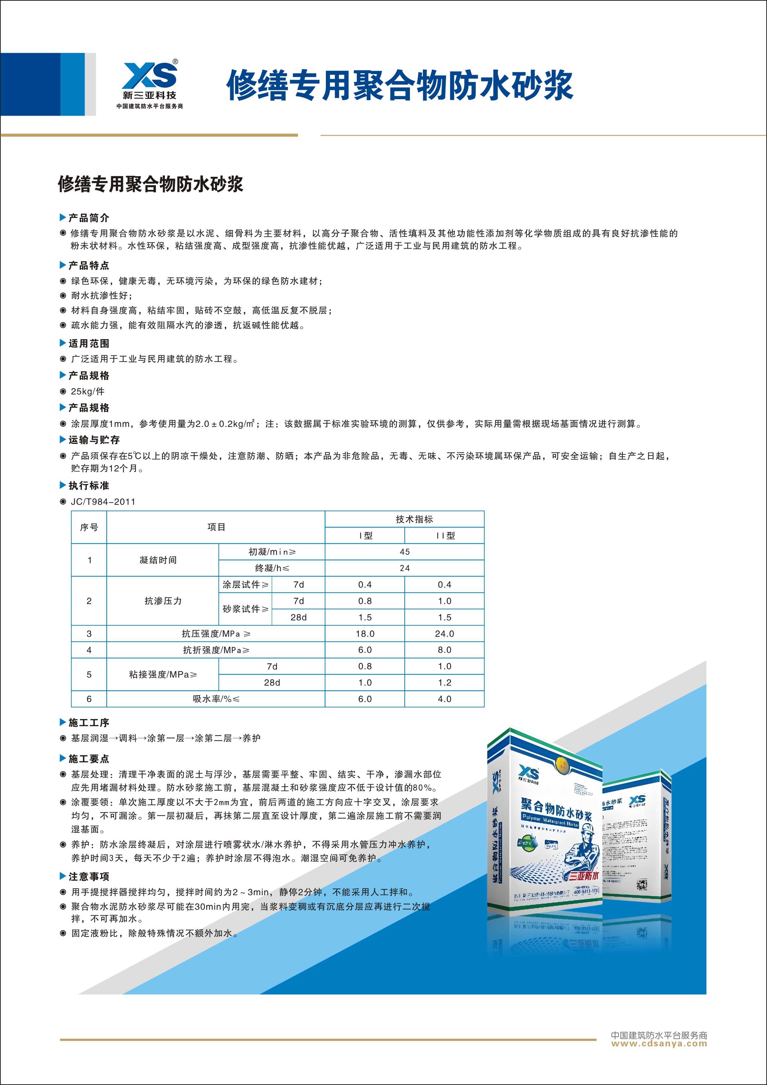 產(chǎn)品簡介: 聚合物水泥防水砂漿是是以水泥、細骨料為主要材料,以高分子聚合物、活性填料及其他功能性添加劑等化學物質組成的具有良好抗?jié)B性能的粉未狀材料。水性環(huán)保,粘接強度高、成型強度高,抗?jié)B性能優(yōu)越,廣泛適用于工業(yè)與民用建筑的防水工程。 規(guī)格:25kg/袋 | ![]() | ![]() |