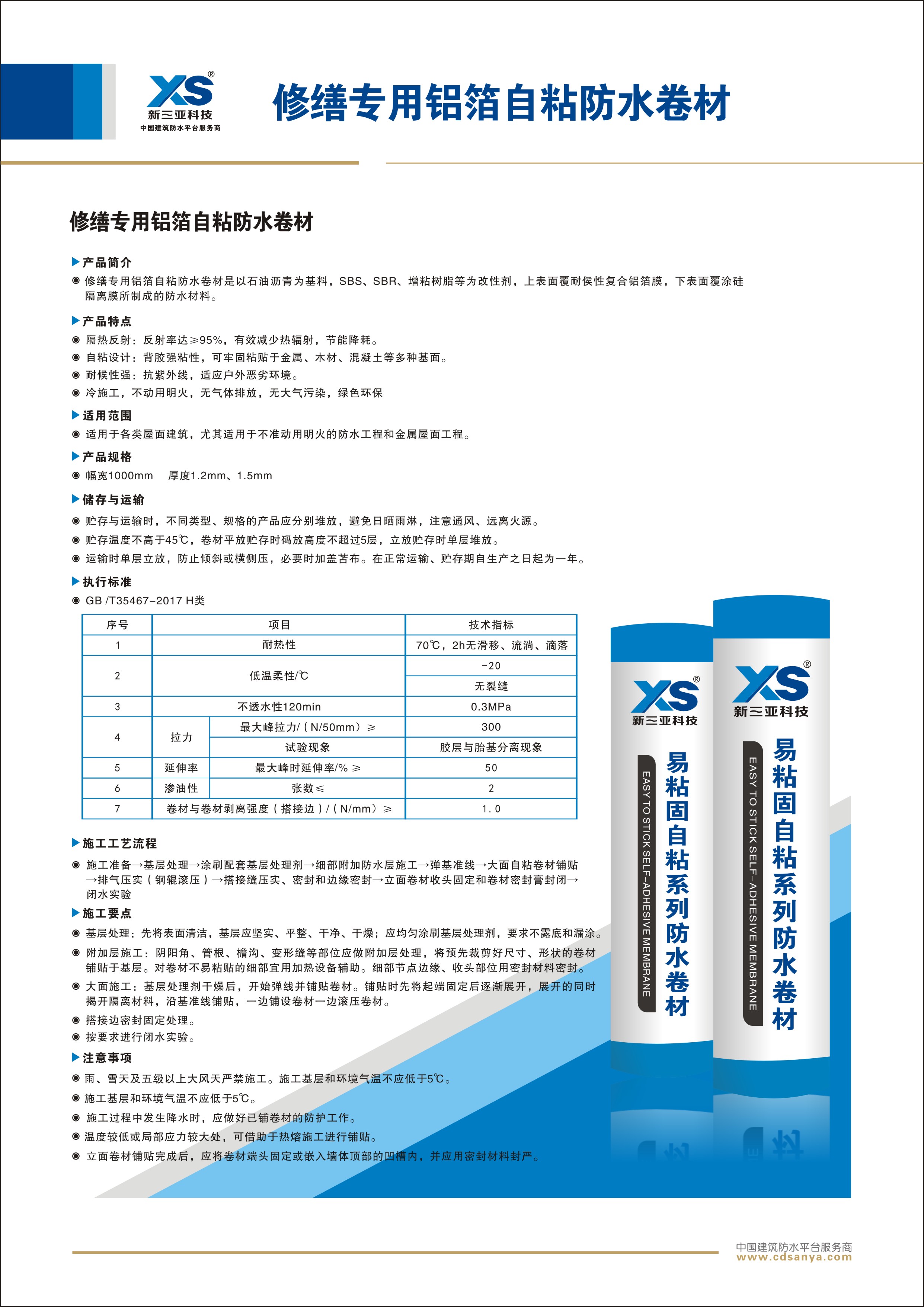 產品簡介 修繕專用鋁箔自粘防水卷材以石油瀝青為基料,SBS、SBR、增粘樹脂等為改性劑,上表面覆耐侯性復合鋁箔膜,下表面覆涂硅隔離膜所制成的防水材料。 規(guī)格:1.5mm 1m×20m | ![]() |