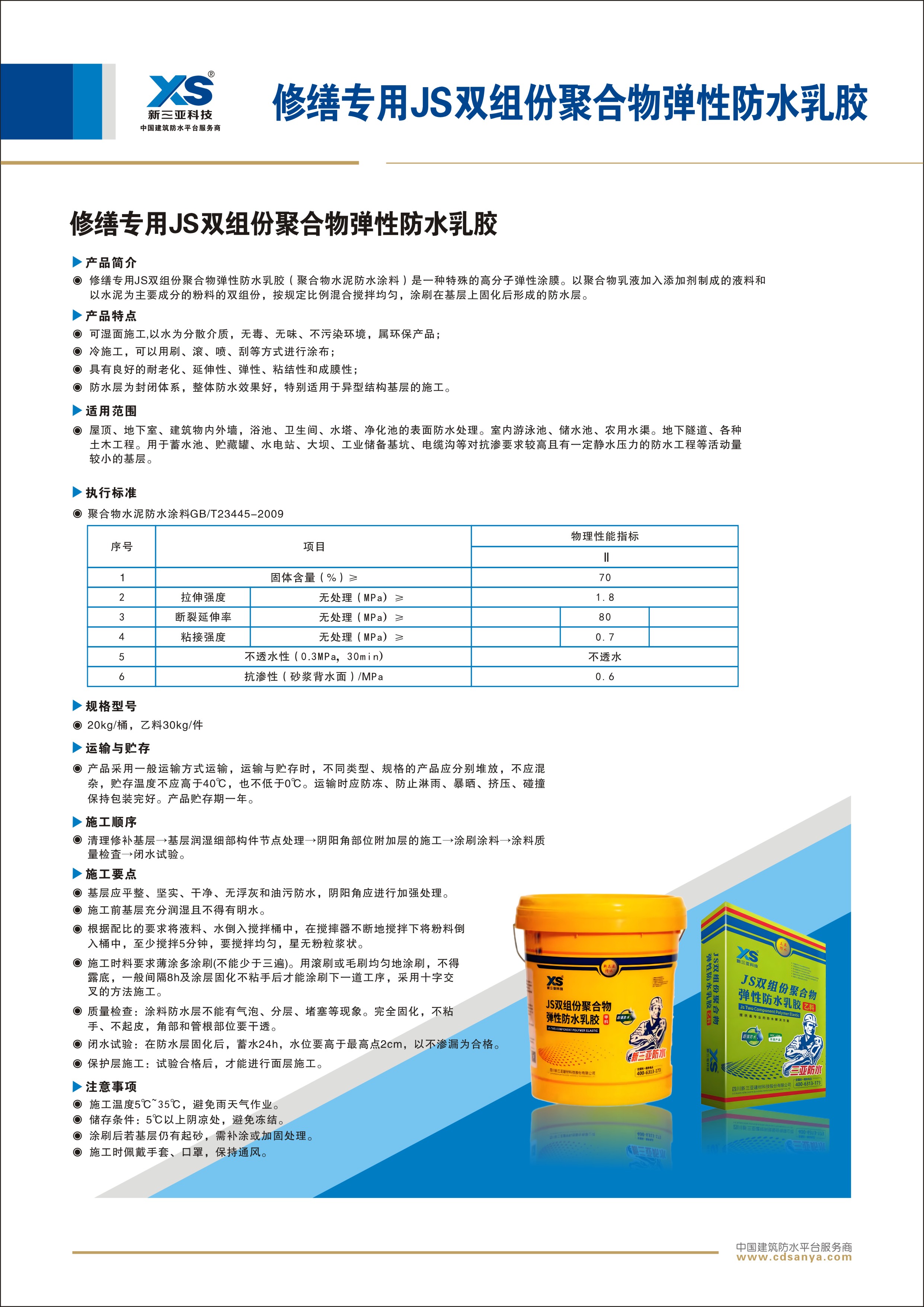 產(chǎn)品簡介: 修繕專用JS雙組份聚合物彈性防水乳膠是一種特殊的高分子彈性涂膜。以聚合物乳液加入添加劑制成的液料和以水泥為主要成分的粉料的雙組份,按規(guī)定比例混合攪拌均勻,涂刷在基層上固化后形成的防水層。該產(chǎn)品由甲、乙組份組成。 規(guī)格:J甲料20kg/桶,乙料30kg/件 | ![]() |